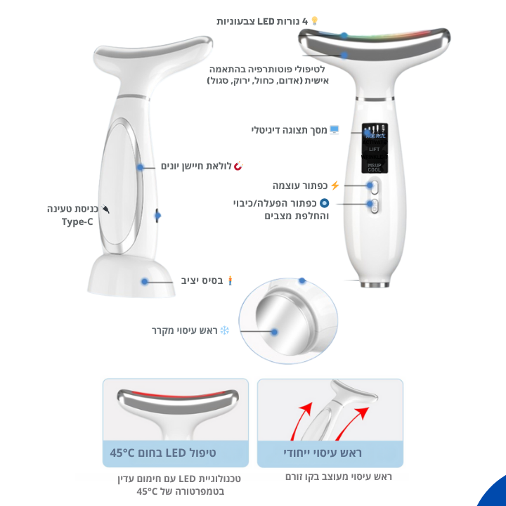 המכשיר מציע טיפול ממוקד בצוואר ובפנים, מסייע במיצוק, בעידוד ייצור קולגן ובהחלקת קמטוטים. התמונות מדברות בעד עצמן – תוצאות נראות לעין בשימוש עקבי בבוקר ובערב!