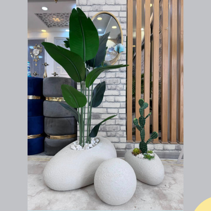 עציצים מעוצבים בצורת חלוקי נחל שמכניסים טבע ואלגנטיות לכל חלל. השילוב של הירוק הרענן עם גווני האבן העכשוויים יוצר מראה טבעי ומרגיע, מבלי הצורך בתחזוקה. מושלם לעיצוב סלון מודרני, למשרדים, לחדרי אירוח או לחללי חוץ מעוצבים.